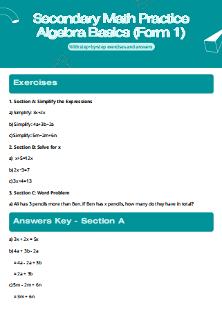 Secondary Math Practice: Algebra Basics (Form 1) – With Answers A handy PDF practice set for Form 1 students to master algebra fundamentals. Includes clear exercises and step-by-step answers—perfect for self-study, homework, or exam prep. Build confidence and make algebra simple!